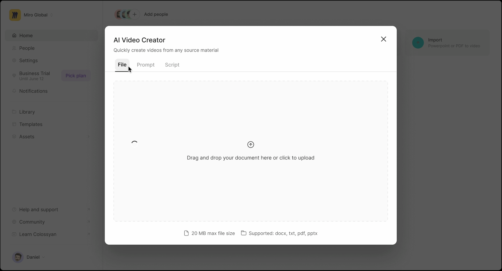 The initial idea was to combine all of the different types of video creation into one interface. You could start by uploading a file, prompting the LLM, or by writing an exact script. After a round of user tests we realised that this kind of segmentation complicated things as users struggled to find the correct tab for their use case.
